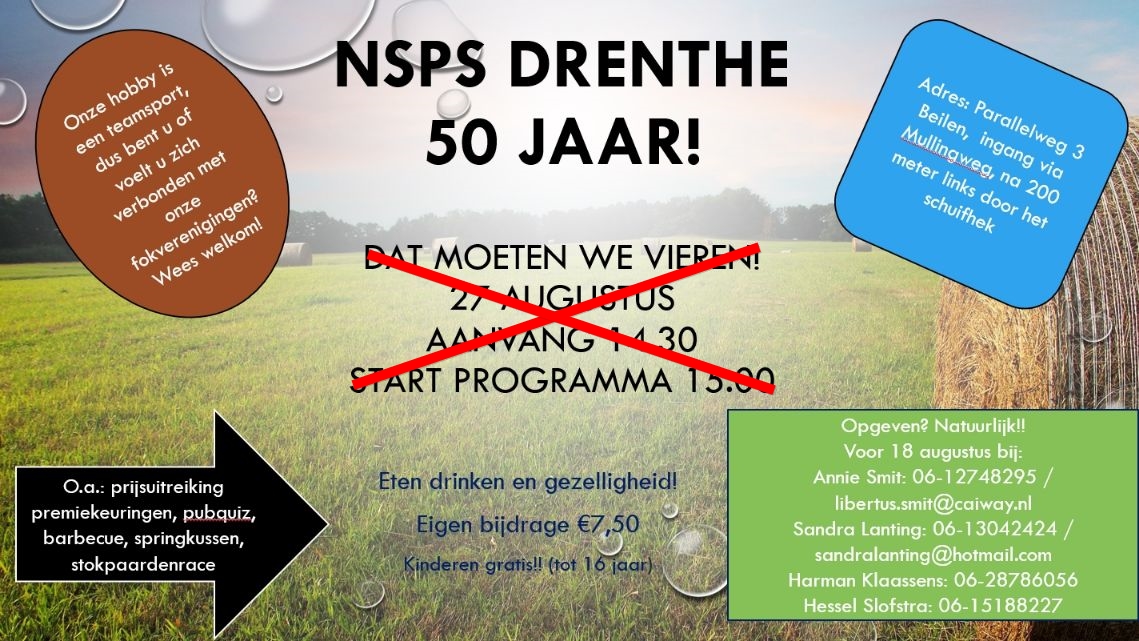 Hierdoor gaat het geplande feest voor het 50 jarig bestaan NSPS Drenthe op 27 augustus a.s. niet door.